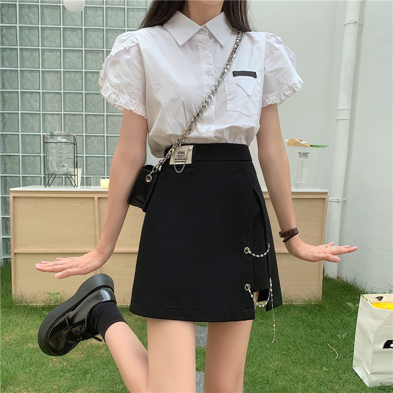 原创设计韩版黑色链条遮肉半身裙高腰短裙开叉裙裤遮肚潮可盐可甜热门设计联盟服务商