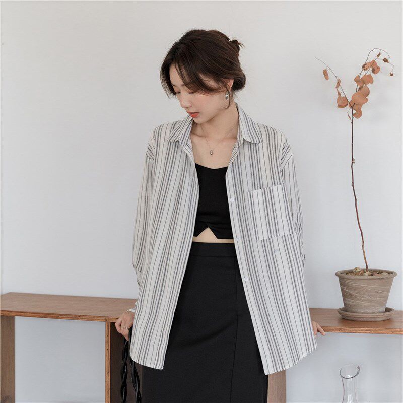 [条港衬衫女竖条纹上衣长袖衬衣设计感J小众复古纹风中士女长款新热门设计联盟服务商